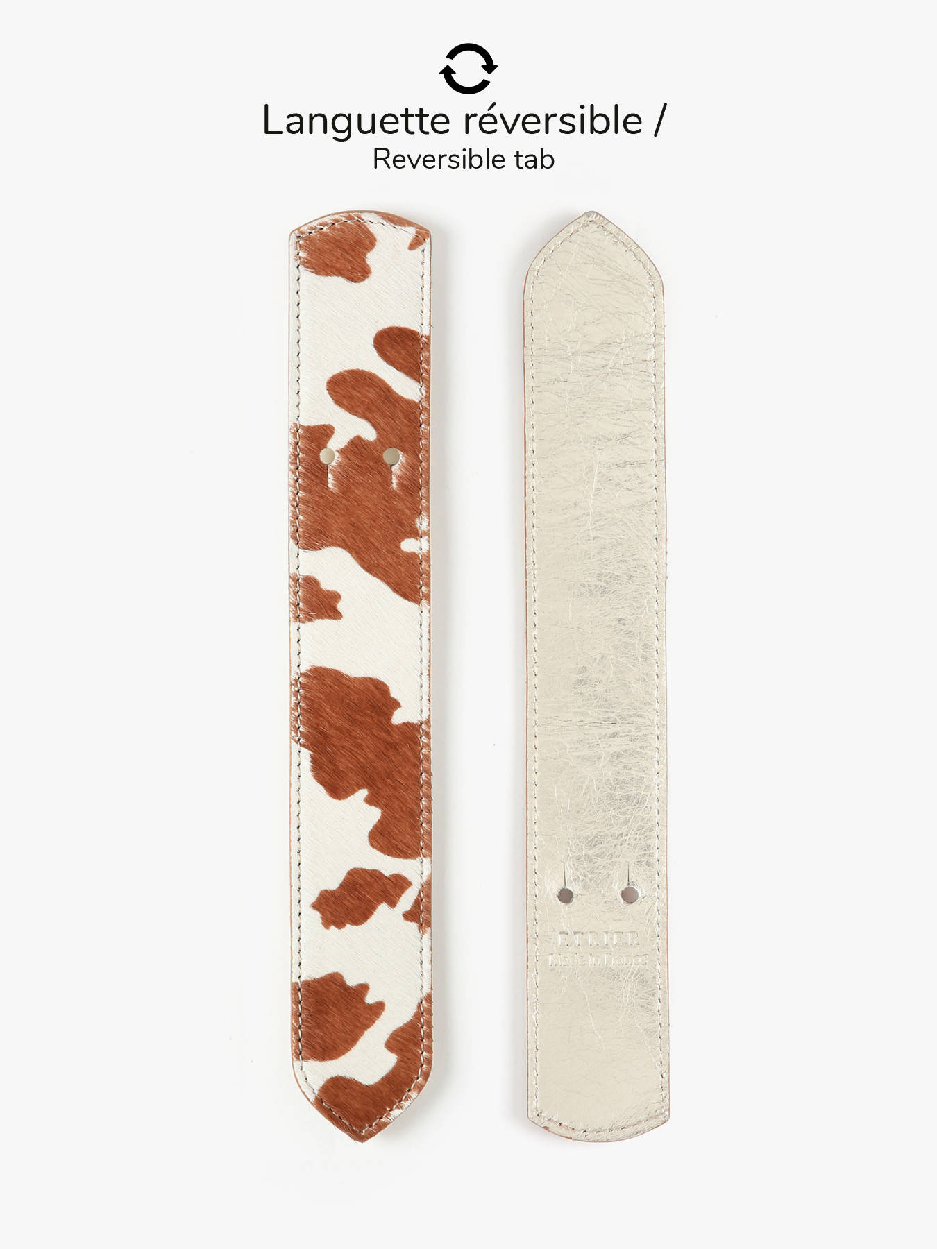 Personalize your Agnès bag with elegance thanks to the ETRIER statement tab. Reversible and crafted in France, it features the signature ETRIER embossed finish. One side showcases animal-print hair-on leather, while the other is crafted in gold leather—allowing you to switch styles effortlessly based on your mood.