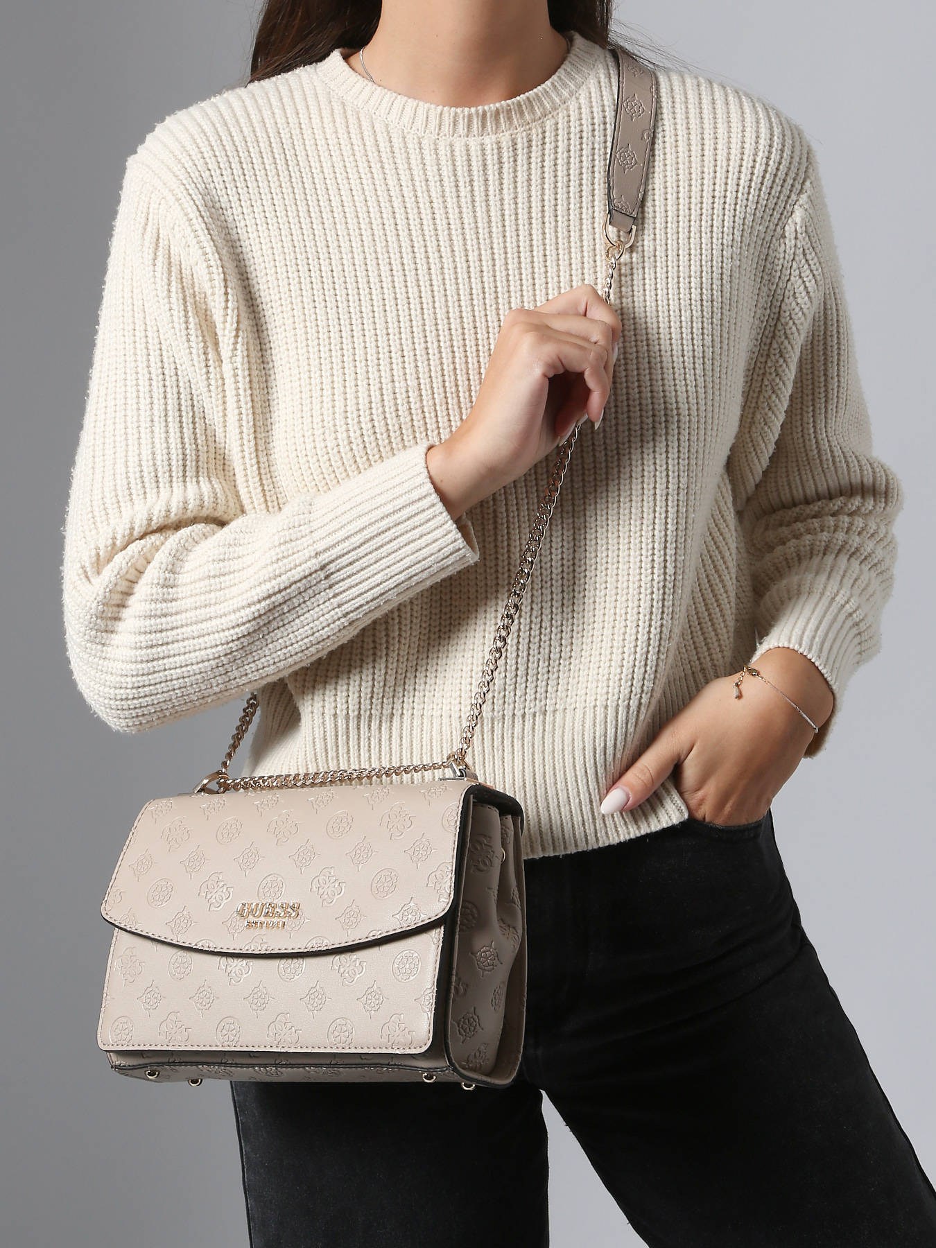 The PHOEBE crossbody bag by GUESS captivates with its chic, contemporary allure—perfect for elevating your everyday looks. Crafted from coated canvas, it combines lightness, durability, and meticulous finishing for an accessory that’s both elegant and functional. Its flap with magnetic closure adds a modern touch while ensuring quick access to your essentials. A discreet back pocket provides convenient storage for small items. Inside, the well-designed layout includes a spacious main compartment, a zip pocket, a slip pocket, and three card slots for optimal organization. With its adjustable strap, it can be worn comfortably over the shoulder or across the body. The PHOEBE bag by GUESS beautifully blends style, practicality, and sophistication.