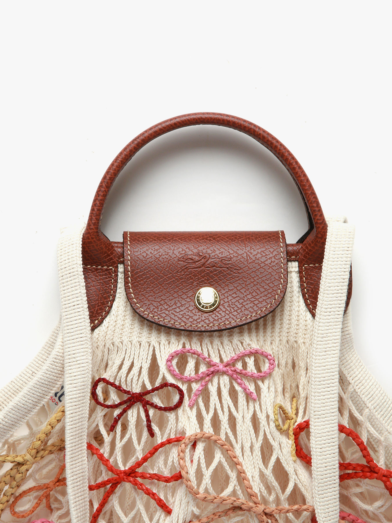 The Le Pliage Collection mesh bag by LONGCHAMP is crafted from cotton canvas and adorned with raffia knots handwoven by artisans from the NGO ANAKA in Madagascar, elegantly reinventing a classic piece. These artisanal details create subtle color gradients inspired by summer sunsets and the ocean, celebrating both authentic craftsmanship and the beauty of nature. This large, lightweight bag features a Russian leather flap, snap closure, and a single compartment, combining practicality and uniqueness. With a 5.5 cm handle height, it can be carried on the shoulder or by hand, perfect for carrying your summer essentials with style and ease. True to the PLIAGE codes, this collection is renewed season after season to accompany a creative and dynamic daily life, full of elegance.