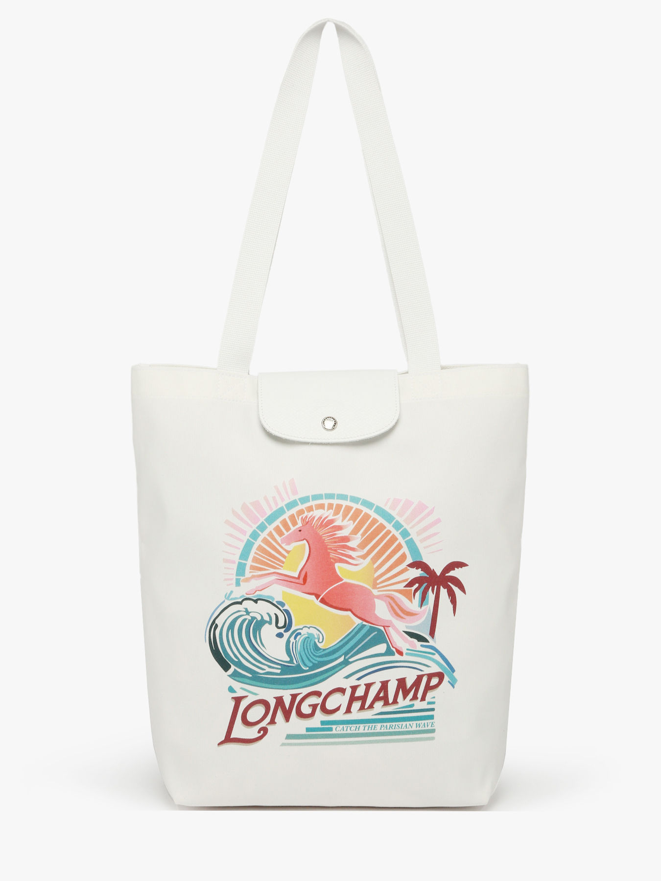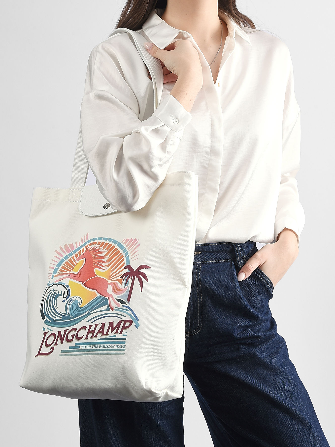 The Le Pliage M Tote Bag LONGCHAMP embodies the ultimate summer spirit. Crafted from thick, durable cotton canvas and enhanced with tonal white trims, it exudes a fresh, refined look. Its sunny print features Longchamp’s iconic horse riding a wave, a nod to beach days and golden summer evenings. Equipped with a snap closure, a single interior compartment, and a simple pocket, it offers ample space for A4 documents, a laptop, and everyday essentials. Leather accents and silver metal finishes add elegance and sophistication, while the 30 cm handle height ensures comfortable shoulder carrying. Versatile and chic, this Le Pliage tote perfectly combines style, functionality, and summery energy, staying true to the line’s spirit that reinvents itself each season for a creative and dynamic everyday life.
